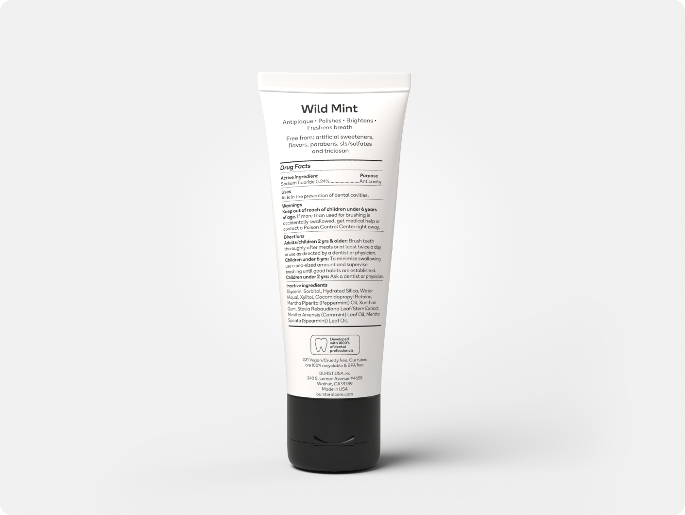 BURST vegan, cruelty-free pastes use natural, effective ingredients with no parabens, SLS, BPAs or artificial sweeteners. Just effective, enamel safe ingredients such as: